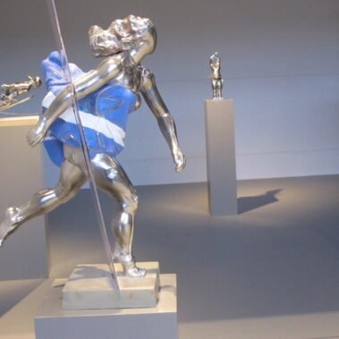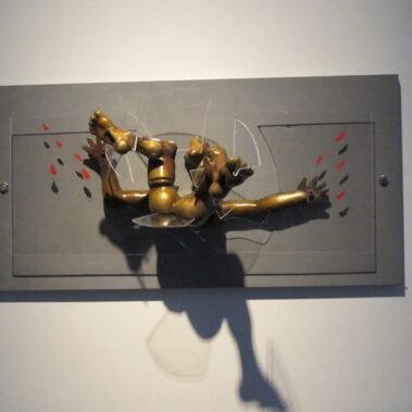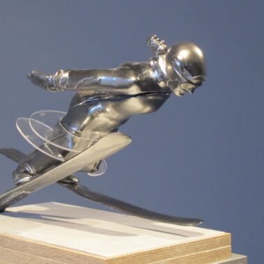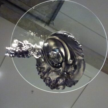 Μια χορεύτρια πάγου, που σταμάτησε σε μια στιγμή  της ιλιγγιώδους κίνησης της πιρουέτας – Biellmann, τεμνόμενη από τρείς γυάλινες κυκλικές πλάκες, μισή παραστατική, μισή αφηρημένη και με ρωγμές.