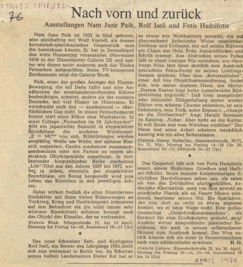 O Nam June Paik γεννήθηκε στην Σεούλ το 1932, συνομήλικος του Volf Vostell που θα μπορούσε να χαρακτηρισθεί σαν το αντίθετο Αμερικανο-Κορεάτικο κομμάτι. Οργάνωσε το πρώτο του Happening στην Γερμανία, το Νοέμβριο του 1959 στην Γκαλερί 22 στο Düsseldorf, και αργότερα ασχολήθηκε με το θέμα της Τηλεόρασης. Η γκαλερί Block παρουσιάζει τα σχέδια του που αναφέρονται στην ΤV.