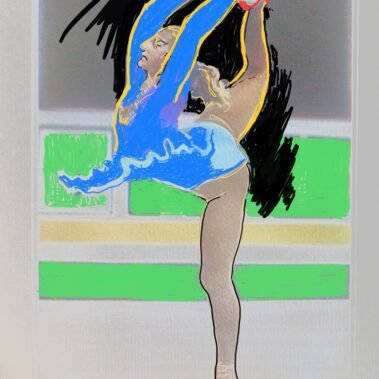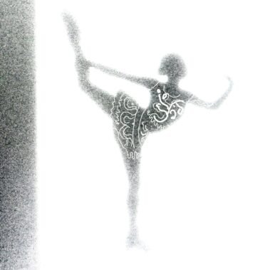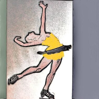 Μια χορεύτρια πάγου, που σταμάτησε σε μια στιγμή της ιλιγγιώδους κίνησης της πιρουέτας – Biellmann, τεμνόμενη από τρείς γυάλινες κυκλικές πλάκες, μισή παραστατική, μισή αφηρημένη και με ρωγμές.