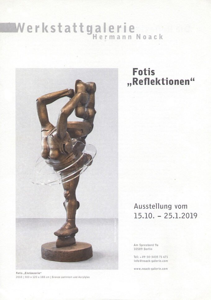 Χώρος: Γκαλερί Werkstatt Noack Πόλη: Βερολίνο Χώρα: Γερμανία Έτος: 2018 ΕΚΘΕΣΗΟι αντανακλάσεις της Χορεύτριας πάγου Μια χορεύτρια πάγου, που σταμάτησε σε μια στιγμή της ιλιγγιώδους κίνησης της πιρουέτας – Biellmann, τεμνόμενη από τρείς γυάλινες κυκλικές πλάκες, μισή παραστατική, μισή αφηρημένη και με ρωγμές. Μια τέτοιας μορφής φιγούρα του γλύπτη Φώτη παρουσιάζει η γκαλερί του H.Νοack, ένα…