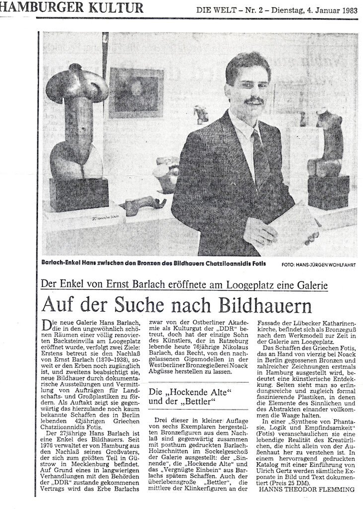 Η νέα Γκαλερί Hans Barlach, που άνοιξε σε ασυνήθιστα ωραίους χώρους μια ανακαινισθείσα  βίλλα  στην Loogeplatz, έχει δύο σκοπούς: πρώτον να φροντίζει την κληρονομιά των έργων του  Barlach  (1870-1938), όσο του επιτρέπεται ακόμη να έχει πρόσβαση στην κληρονομιά, και δεύτερον αποσκοπεί να προωθήσει νέους γλύπτες μέσω εκθέσεων, παρουσιάζοντας τα έργα τους σχέδια, καταλόγους και μεσολαβώντας για παραγγελίες  μεγάλων γλυπτών στους δημόσιους χώρους. Σαν αρχή επέλεξε να δείξει τον 42χρονο Έλληνα γλύπτη  Φώτη Χατζηιωαννίδη, που ζει στο Βερολίνο.