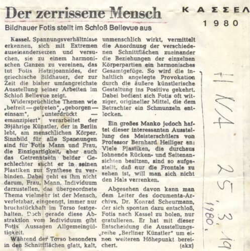 Όμως πέρα από αυτό θα πρέπει κανείς να συγχαρεί τον διευθυντή του Αρχείου της Ντοκουμέντα του Κάσσελ Δρ.Konrad Scheuermann που αποφάσισε αυθόρμητα να φέρει τον Φώτη στο Κάσσελ. Με αυτήν την απόφασή του διεύρυνε και ανέβασε πολύ υψηλά το πρόγραμμα του “Βερολινέζοι καλλιτέχνες”.